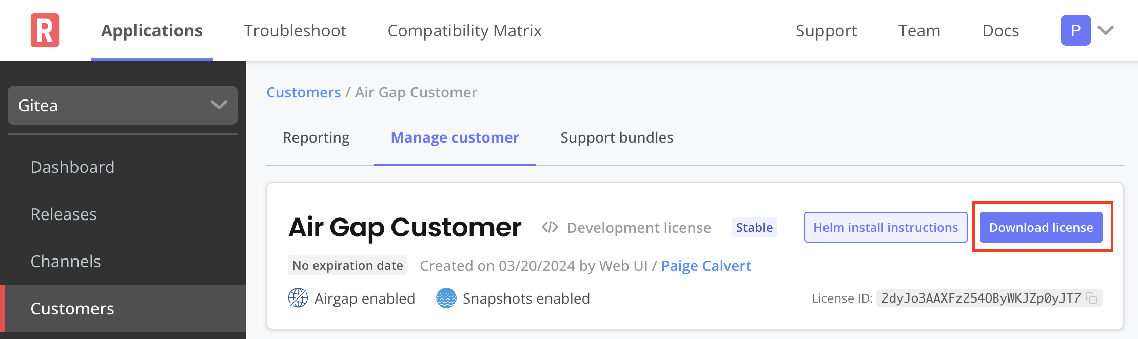 At the top of the screen, click Download license to download the air gap enabled license.